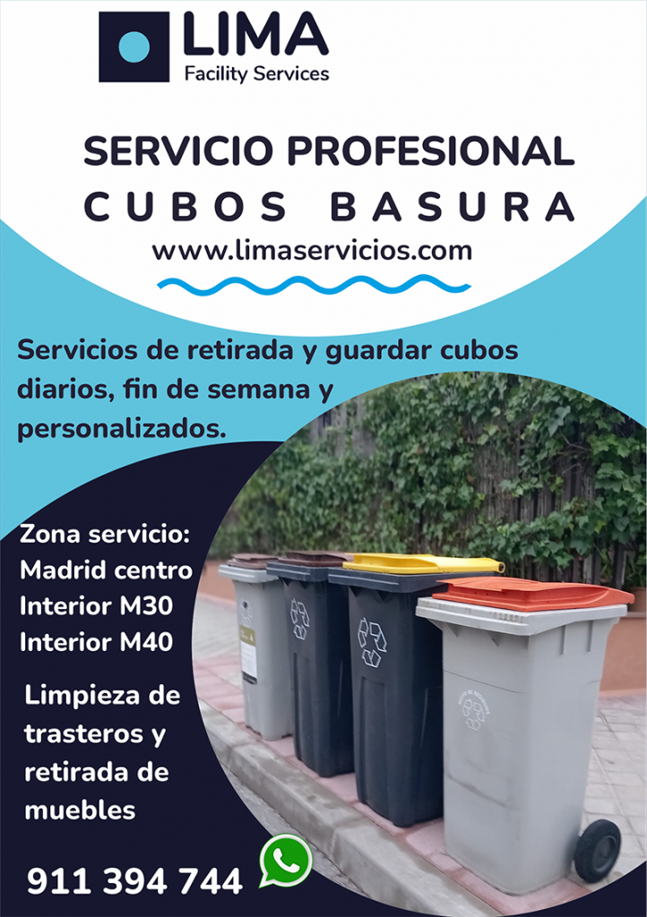 Se realizará los días que la comunidad de Madrid tenga recogida, nuestra labor será retirar y recoger los cubos a la hora concertada, manteniendo dichos cubos en optimo estado de limpieza, LIMA Servicios, también retira y guarda los cubos de basura en fines de semana y festivos.